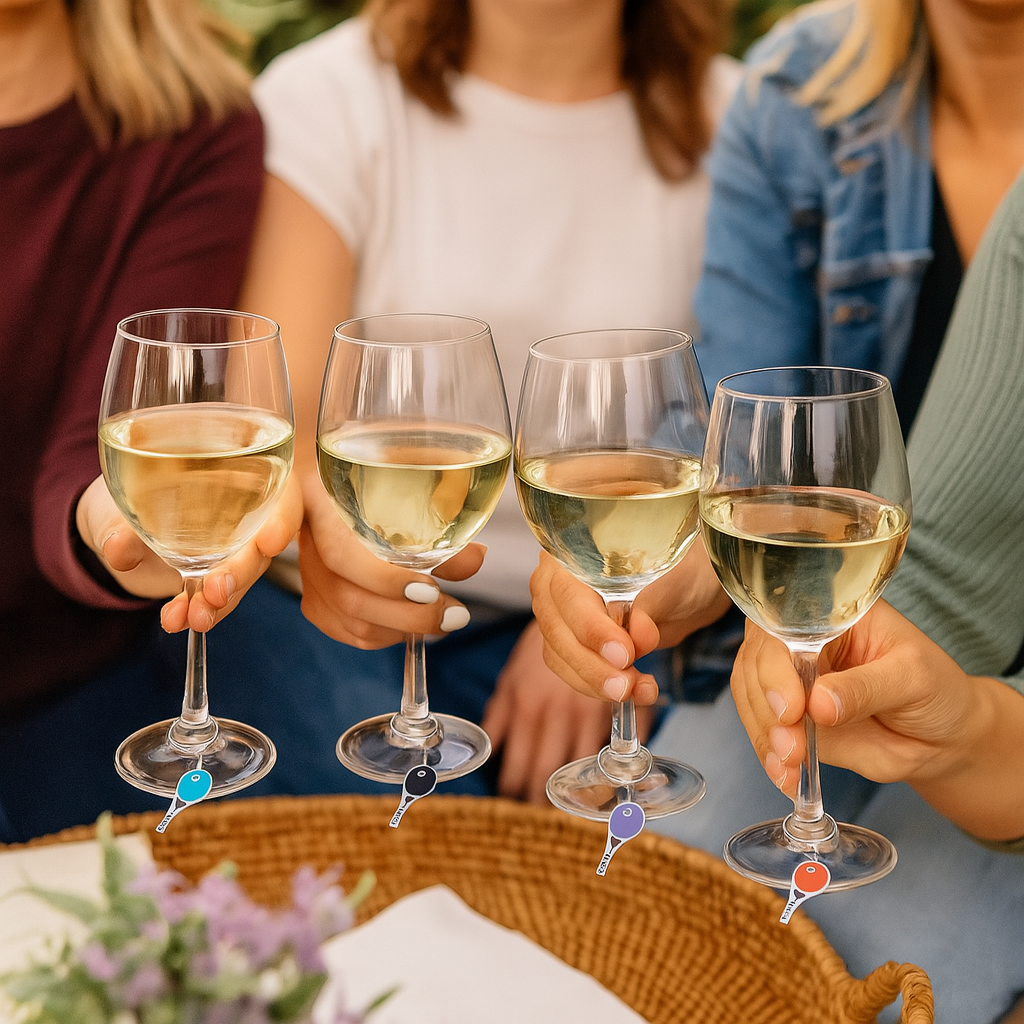 Silver tennis racket wine charms set with colorful designs, perfect tennis gift and accessories for wine lovers.